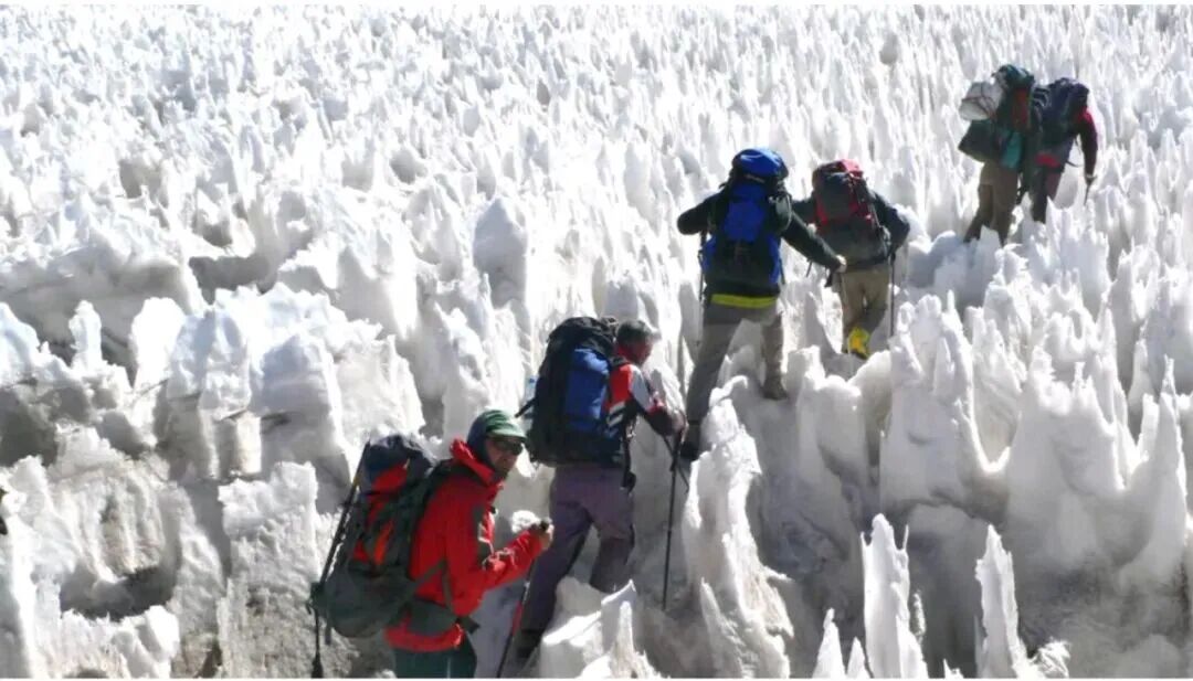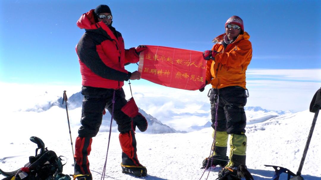 (图片说明:金飞豹教授一行穿过冰塔林,登上8844.43米的珠穆拉玛峰之巅)