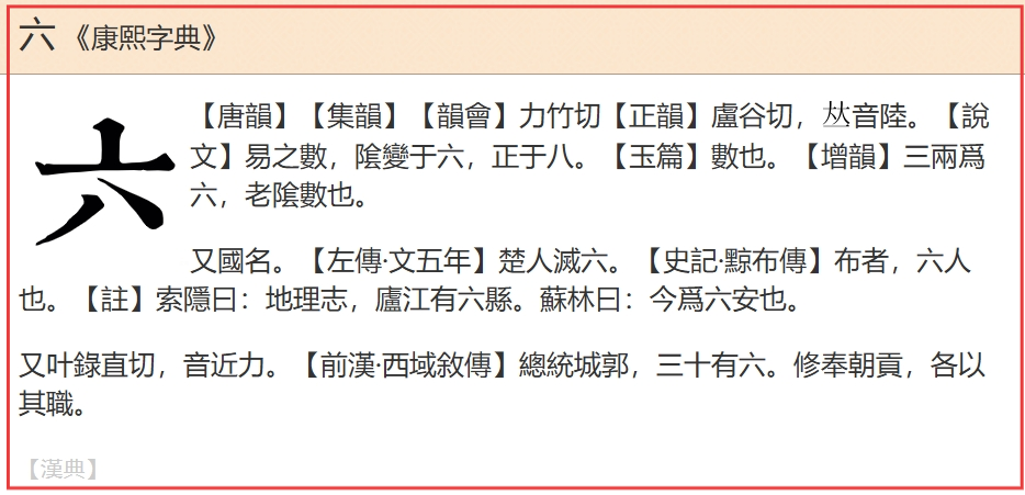 查《康熙字典》“六”字:国名。《左传·文五年》:“楚人灭六。”《史记·黥布传》:“布者,六人也。”《索隐》曰:“《地理志》,庐江有六县。”苏林曰:“今为六安也。”