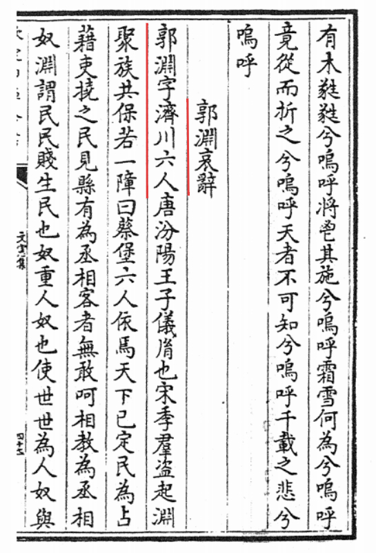 《嘉靖六合县志》自注其《郭渊传》乃是根据《成化六合县志》以及宋濂《哀词》作成,今《成化六合县志》已失传,只能依靠宋濂遗著来作研究。好在宋濂乃是元明之交的大人物,明初著名政治家、文章家,虽然死得有点冤(因长孙宋慎牵入“胡惟庸案”而被流放茂州,病死于中途夔州),但诗文大都编入《宋学士全集》等书传世。笔者谨抄录宋濂《郭渊哀辞》如后,该篇收录在《四库全书》宋濂《文宪集》卷二十九。