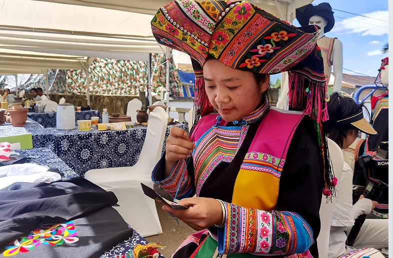 傈僳族手艺人正在现场缝制傈僳服装(徐静/摄)
