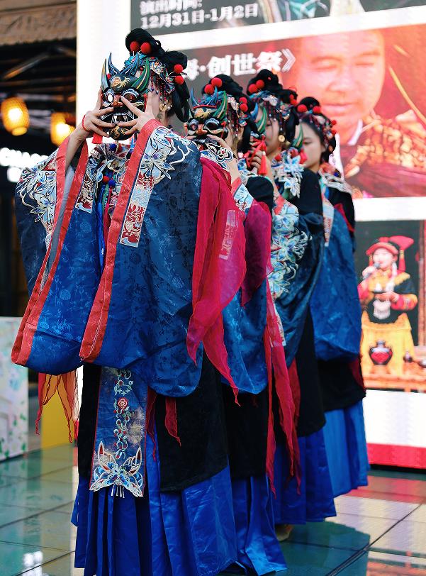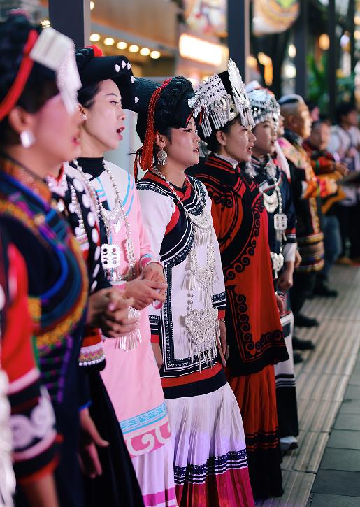 在非遗展演板块,《查姆·创世祭》《诺苏·婚喜宴》等节目轮番上演,毕摩诵经、大锣笙面具舞、海菜腔、烟盒舞等非遗艺术与现代街区氛围交融,吸引众多游客驻足打卡。