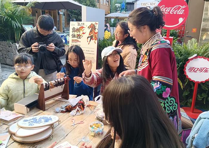 南强街巷的非遗彝绣体验区里,围满了要学彝族刺绣的姑娘们。昆明市非物质文化遗产(彝绣)代表性传承人,家族传承第五代传人刘晓洁,正忙着给大家讲解彝族刺绣的初级针法,“要戴上顶针,针脚细密,互相叠压,不要扎到手……”