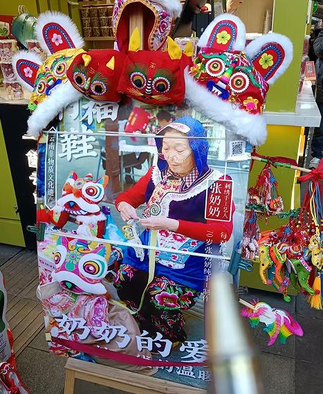 在南强街巷里,还有个不大的小摊子,摆满了各式各样的绣花鞋,毛茸茸的五彩缤纷,煞是好看。旁边的牌子上写着“奶奶的爱——来自一针一线的温暖”。