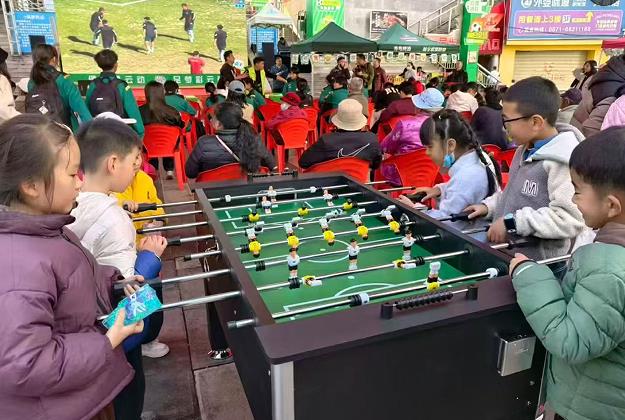 除了通过大屏同步直播滇超赛事,现场还设置颠球挑战赛、桌上足球PK、3人足球趣味对抗等互动环节,吸引不同年龄层的观众参与,增强参与感与娱乐性。