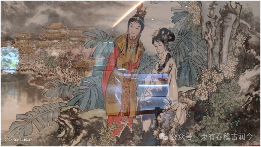 第三件是5ⅹ1.9米的《红楼梦》巨帙。这幅作品将人物绘画艺术与山水绘画艺术进行有机艺术组合,达到了绝佳艺术效果。在大的山水笔墨背景下,烘托出《红楼梦》的主人公贾宝玉、林黛玉形象,人物比例与山水比例适度协调而又不显呆板。在构图上,并不是简单地将人物置于画面正中,而是依据山水草木走势,让人物形象十分自然地呈现在画面中。在人物形象塑造上,将林黛玉的形象描绘得脸蛋饱满,既有小鸟依人的感觉,又没有了传统艺术造型中的那种病怏怏、弱不禁风的感觉,给人一种健康美的林黛玉形象。我想,这应该与章志远大师生来拥有的健康审美心态有关吧。
