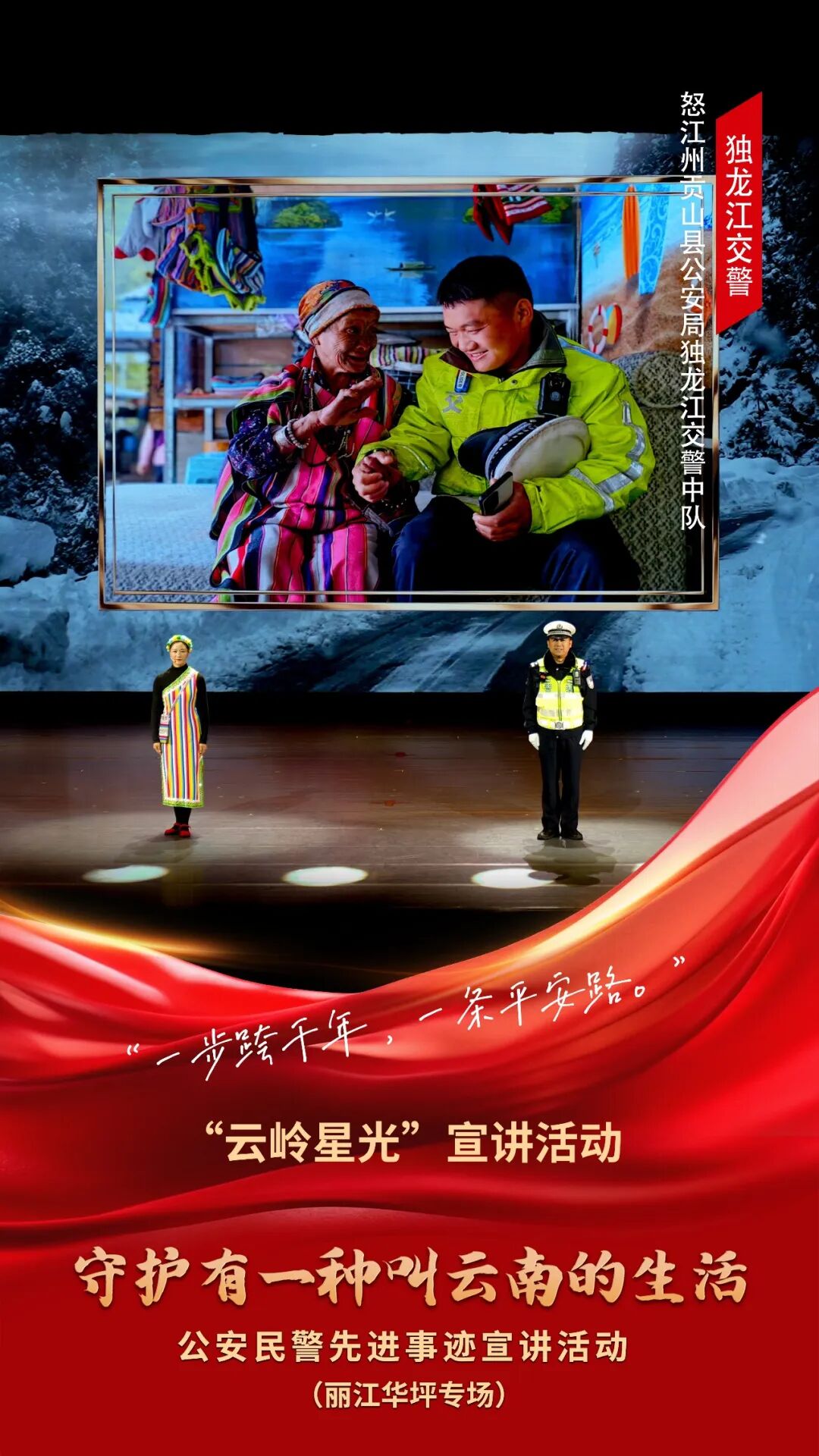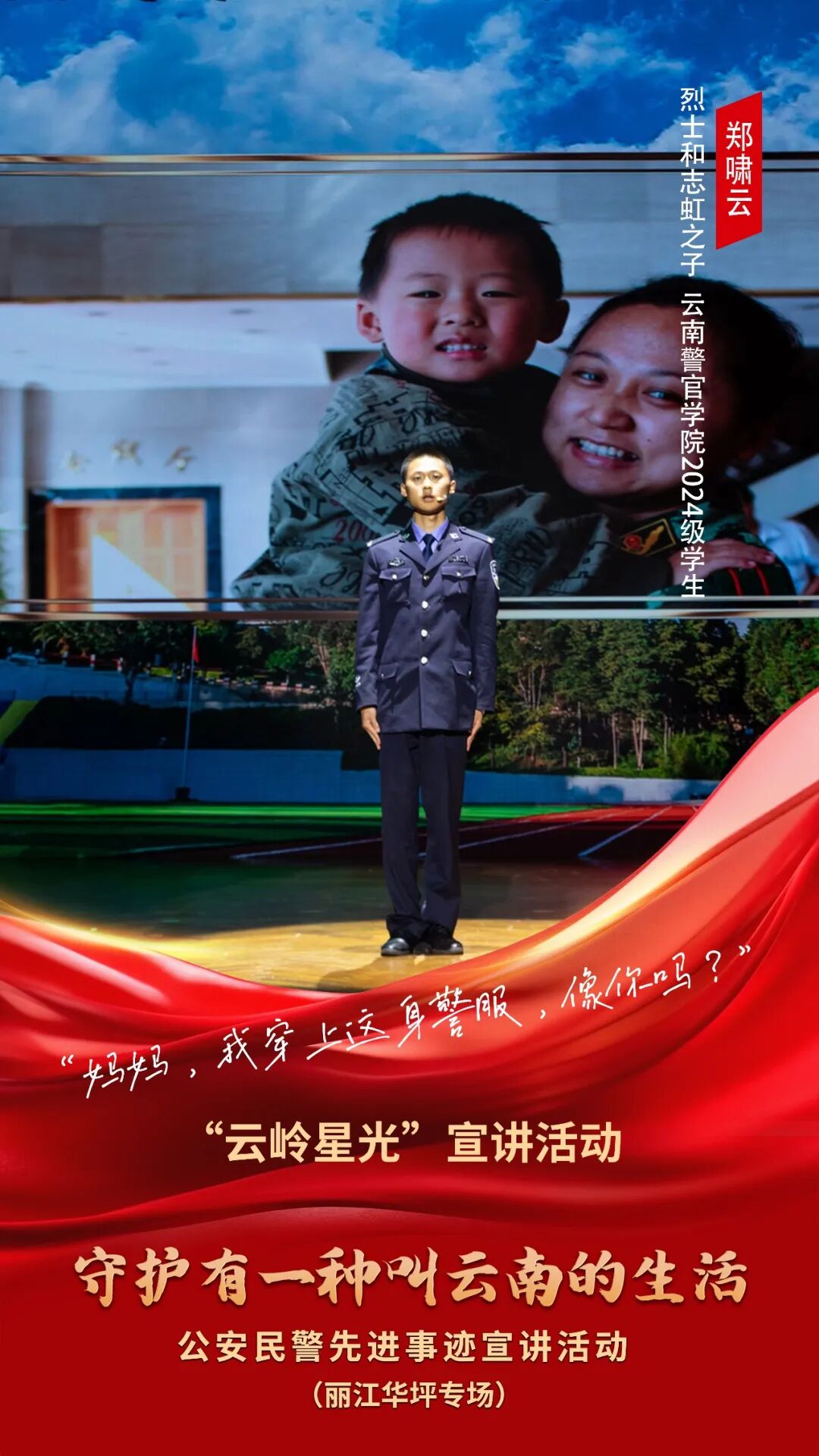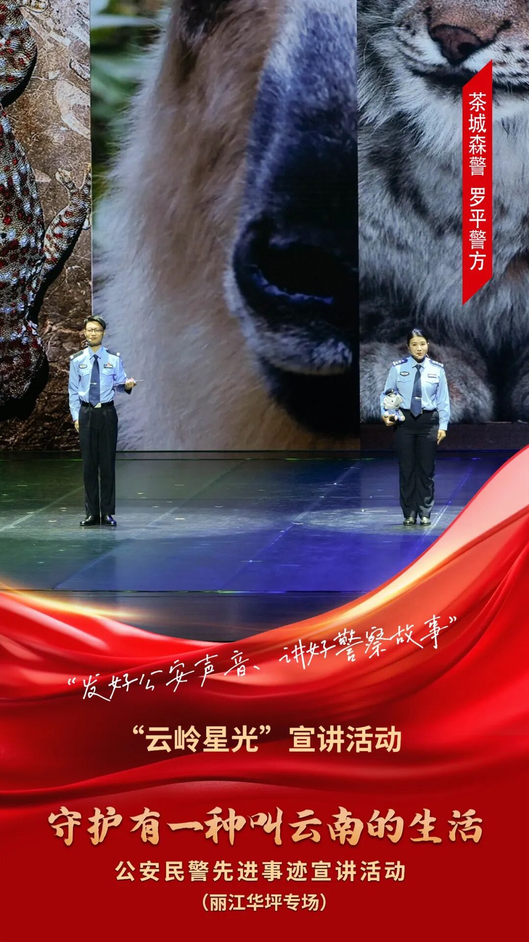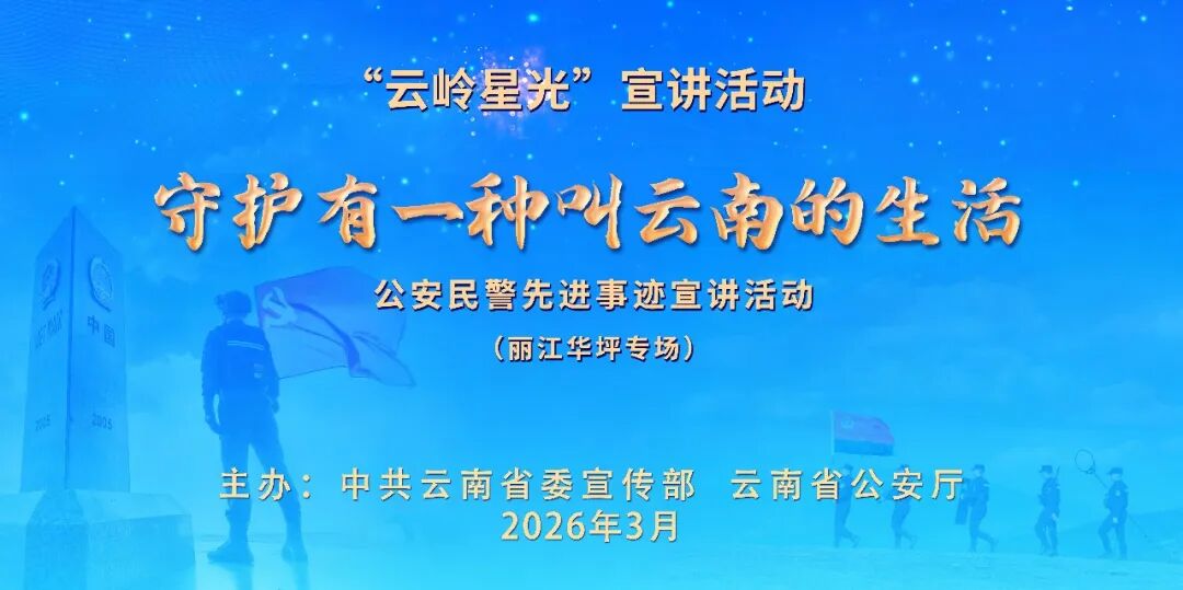 为充分发挥先进典型的示范引领作用,大力弘扬公安英模精神,用榜样的力量激励广大青年学生坚定理想信念、锤炼高尚品格、矢志拼搏奋斗,由中共云南省委宣传部、云南省公安厅联合主办的“云岭星光”宣讲活动——“守护有一种叫云南的生活”公安民警先进事迹宣讲活动(丽江华坪专场),即将拉开帷幕。