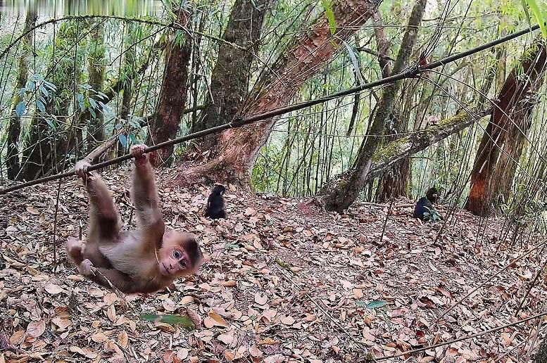 更惹眼的是,一只小猴则攀爬上一棵竹子上,用四肢紧抓摇晃着的竹竿,时不时还不忘用好奇的双眼盯着镜头看,娴熟地展示起“倒挂金钩”,炫耀它的独门绝技……场景十分温馨和睦,“猴”趣横生,萌态可掬,酷似“一家人”在一起聚餐,过着一种其乐融融的惬意生活。