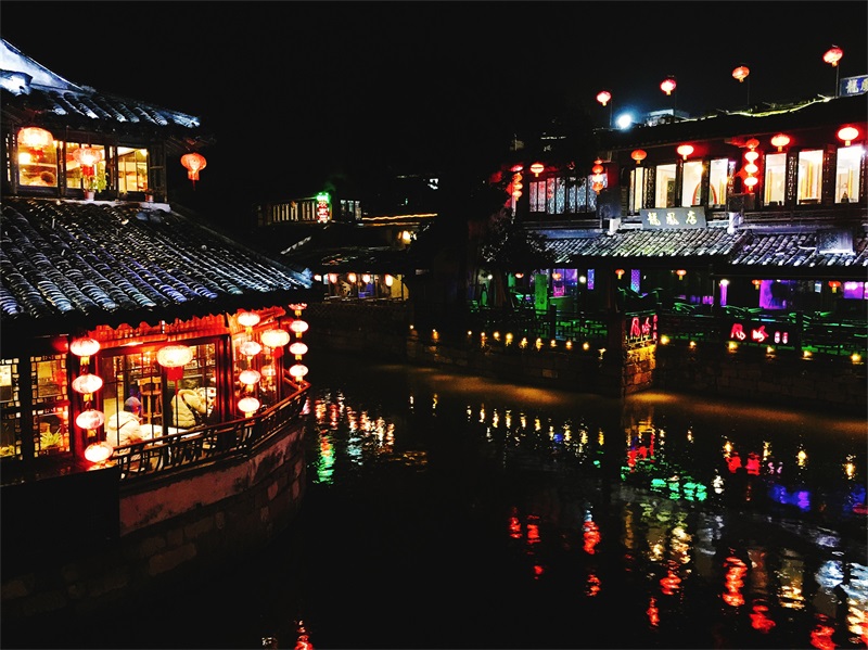 站在桥顶远眺水乡,但见灰墙白瓦层层叠叠,两排大红灯笼在河岸边高高挂起,河中乌篷船缓慢行进,在波光点点的河面留下一道道美丽的航迹,别有一番意境。