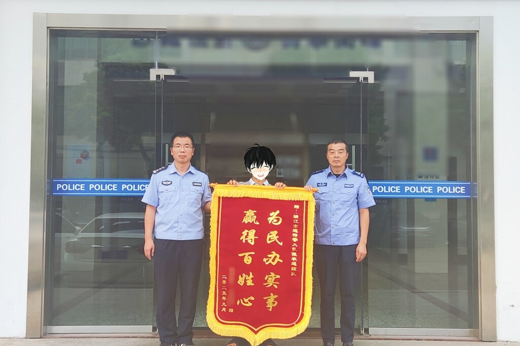 近日,市民许先生来到市公安局巡特警大队,将一面印有“为民办实事 赢得百姓心”的锦旗送到民警赵均和辅警童利民手中,感谢他们及时帮他找回被盗的电动自行车。