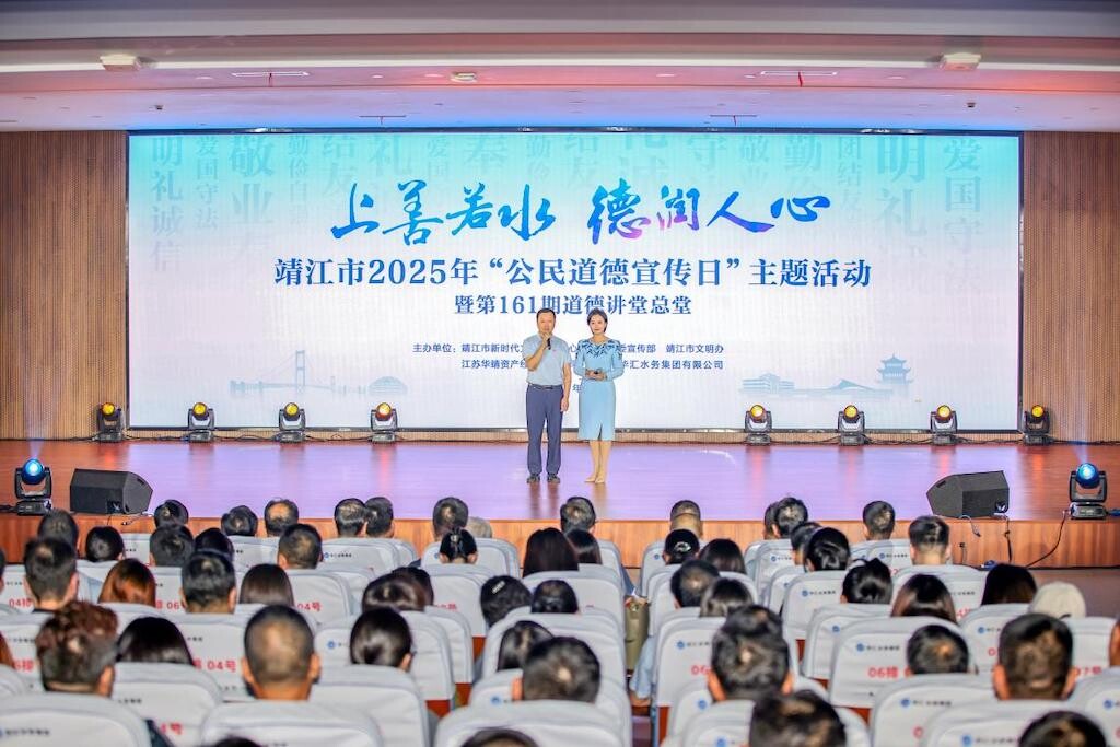9月19日上午,“上善若水 德润人心”——靖江市2025年“公民道德宣传日”主题活动暨第161期道德讲堂总堂在华汇水务集团有限公司举行。百姓善行小剧、故事宣讲、音乐情景剧等精彩节目以身边真人真事为蓝本,把爱岗敬业、无私奉献等社会正能量诠释得淋漓尽致。此次活动拉开了靖江市2025年公民道德宣传月系列活动的序幕。连日来,靖江各地依托新时代文明实践中心(所、站)、道德讲堂、睦邻点等阵地,以主题宣讲、志愿服务等形式,广泛开展公民道德宣传系列活动。