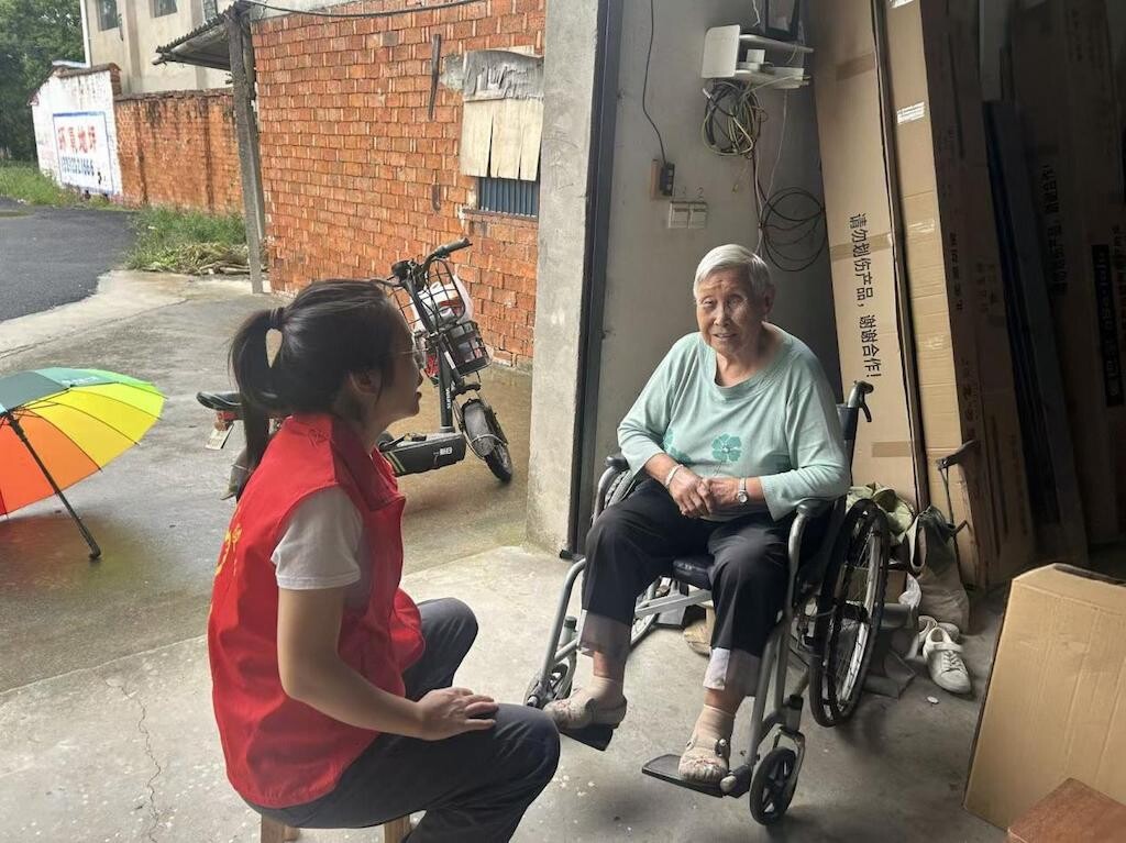 图为孤山镇广陵村志愿者看望独居老人。