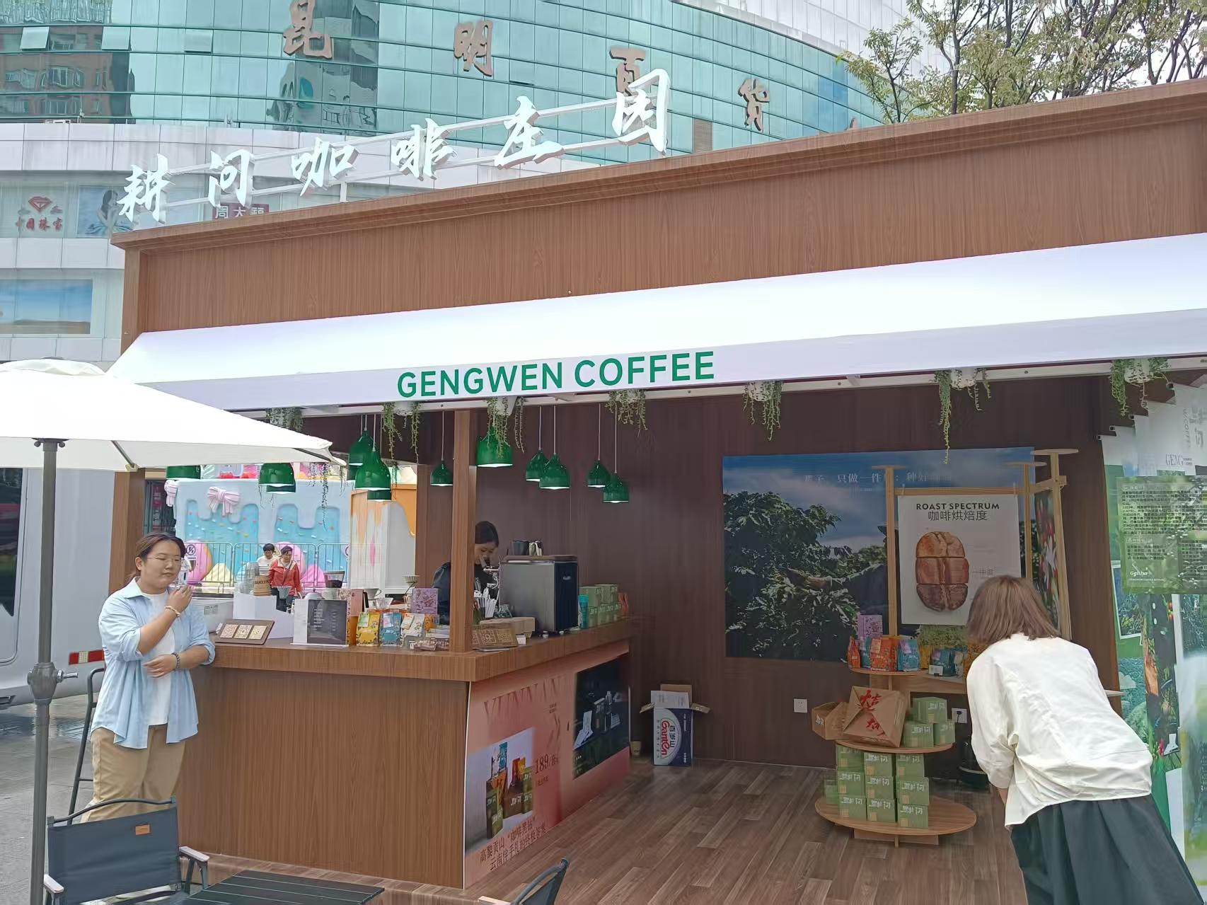 “从高原出发,为世界带来中国的香气”——在南屏街昆百大下面的广场上,耕问咖啡的“小店”前围满了游客。
