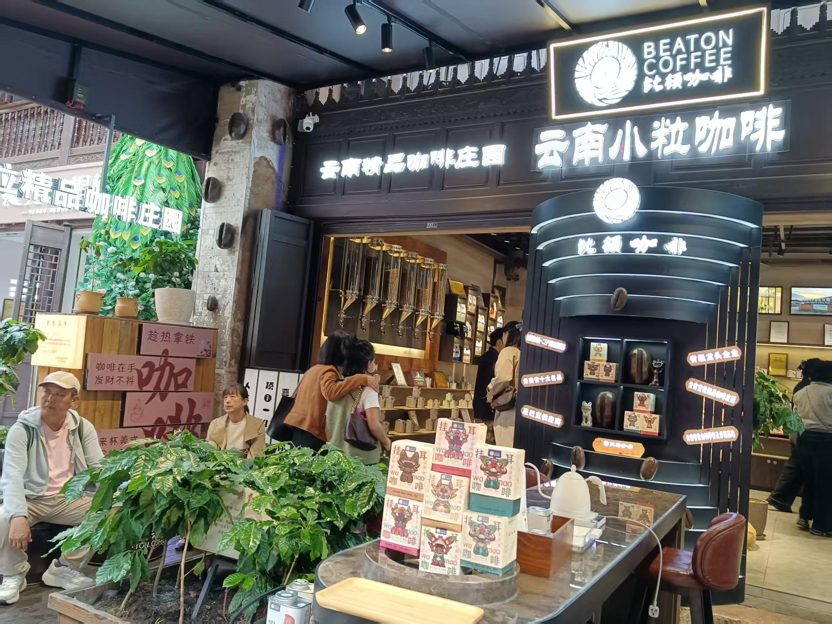 在熙熙攘攘的文明街,也有一家稍大的咖啡店:云南咖啡精品庄园、云南小粒咖啡的代表企业——比顿咖啡文明街店,店长王可芯忙着给顾客介绍店里的咖啡品类。