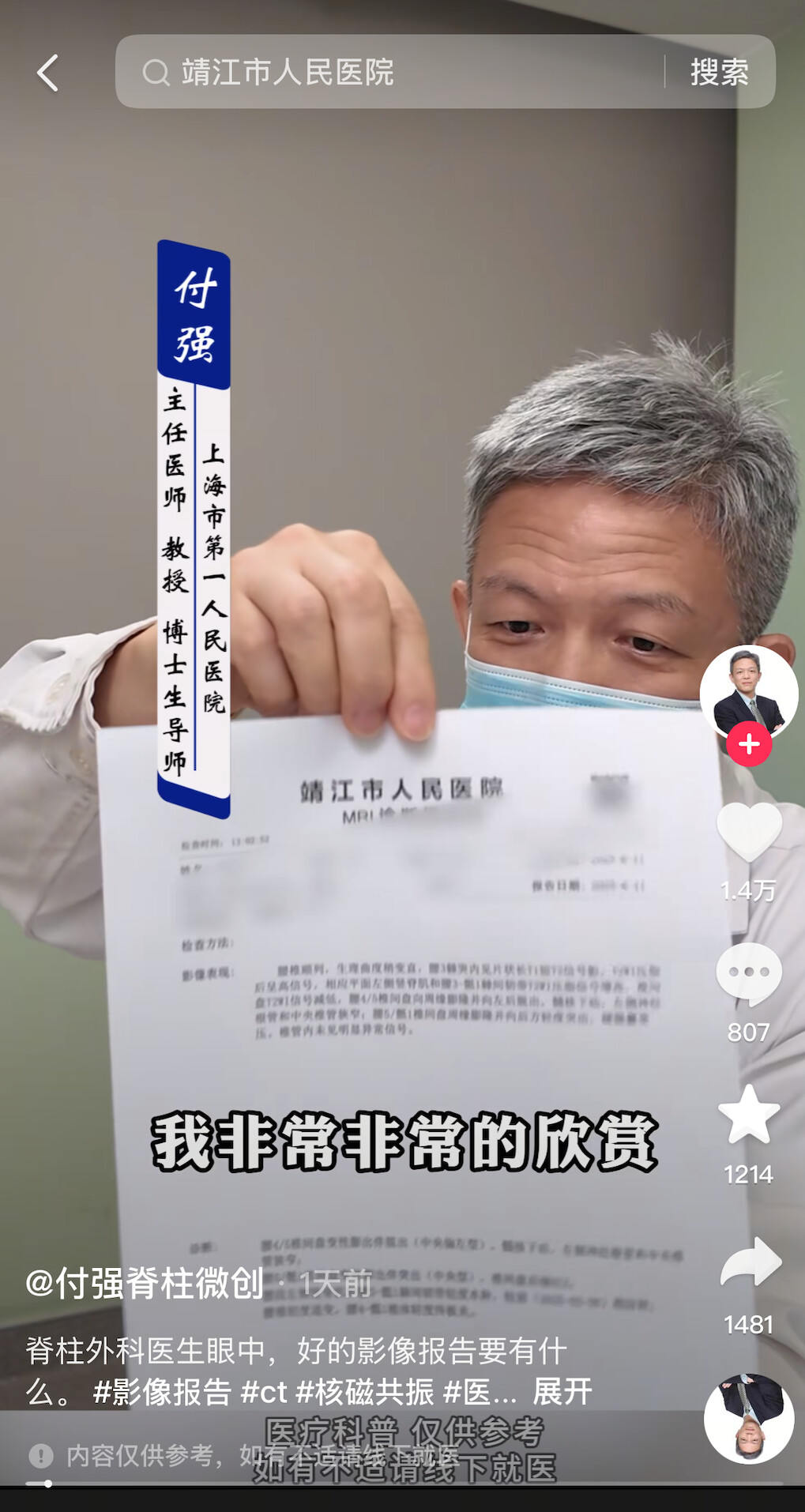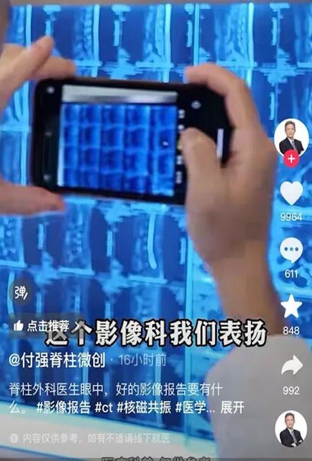 在付强教授的个人抖音号上,记者看到一段名为“脊柱外科医生眼中,好的影响报告要有什么”的短视频。视频中付强展示了一份由我市人民医院医学影像科出具的核磁共振诊断报告单和胶片。“这是一个县级人民医院的报告,我认为它非常标准规范——二维码、编号清晰,诊断第一句话就开宗明义‘术后改变较术前明显好转’。”付强教授在抖音视频中明确表示,该报告达到“标准教学医院水准”,“虽然是县级人民医院,但是比很多三甲全国闻名的大医院放射科的报告都要客观公正,非常好,值得表扬。”