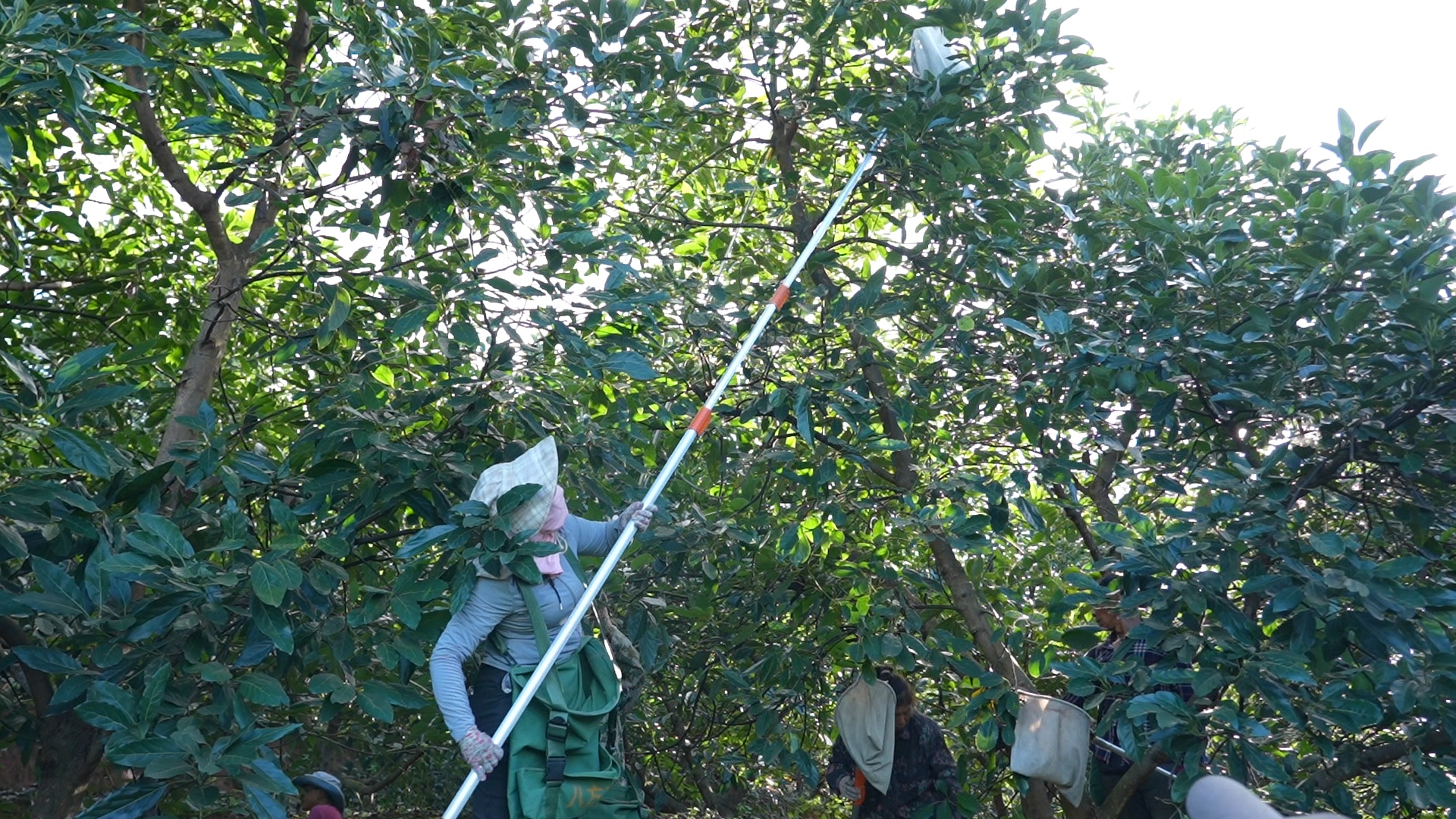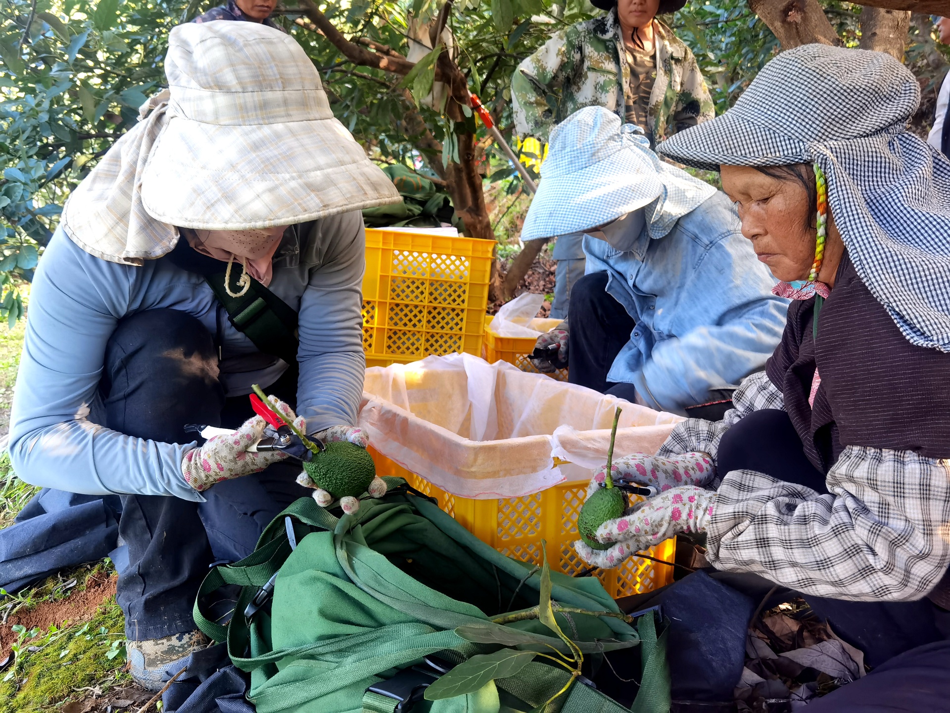 在分拣车间,附近的群众李建明和其他工人,正在熟练地给牛油果分级和套上保护网,她们动作麻利、业务娴熟。