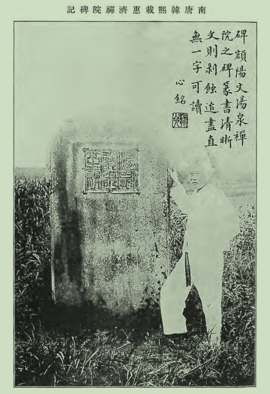 2. 龚心铭民初所见“汤泉禅院之碑”,或为乾隆间那次重修惠济寺时重新刻制并竖立,重建时间当与立“功德碑”同时,即乾隆二十七年(1562)。《乾隆十九年重修惠济寺碑文》末段云:“夫大功告成于兹已五六年矣……向日众姓于垂成之日曾鬻石二方,欲勒捐助姓字以垂不朽。”意思是说,惠济寺重修工程“大功告成”距今已五六年,当初众人曾购置两方碑石,打算镌刻捐助者姓名,以垂不朽。古人称这类碑石叫做“题名碑”,又称“功德碑”。也许这两方碑石中的一方,就用来制作民国初年犹存的“汤泉禅院之碑”。乾隆年间重立的这方碑,一直保存到清末民初合肥人龚心铭来考查、拍照之时。龚心铭《浦口汤泉小志》称,碑身完整,碑额阳文“汤泉禅院之碑”篆书清晰,“文则剥蚀殆尽,直无一字可读”。该照片及考述如下: