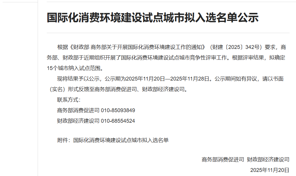 11月20日,商务部消费促进司、财政部经济建设司发布国际化消费环境建设试点城市评选结果公示,全国15个城市拟入选,昆明榜上有名。公示时间为11月20日至28日。