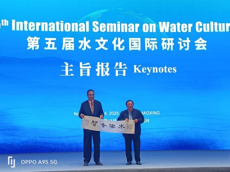 2025年11月13日上午,第五届水文化国际研讨会在浙江绍兴举行,根据大会秘书处安排,夏宝国书法作品 “智者乐水"赠予本次活动主办单位外方单位联合国教科文组织东方办事处主任夏泽翰。