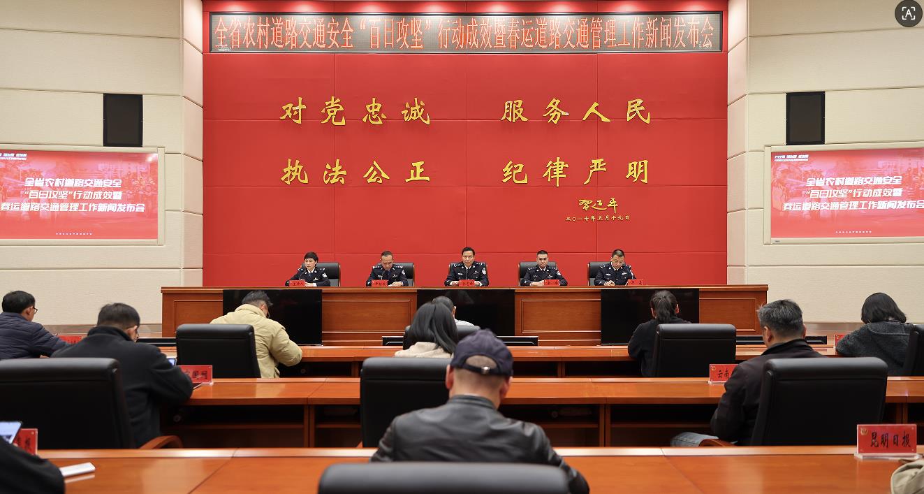 2月2日,是2026春运首日,云南省公安厅召开全省农村道路交通安全“百日攻坚”行动成效暨2026年春运道路交通安全管理工作主题新闻发布会,这也是2026年云南省公安机关“开好局、强治理、促发展”系列主题发布会的首场活动。云南省公安厅交管总队总队长金志锋、副总队长余峰,昆明市公安局交管支队政委尹绍东、曲靖市公安局交管支队支队长毕磊出席发布会,通报相关工作情况,并答记者问。20余家中央驻滇和省内媒体参加发布会。