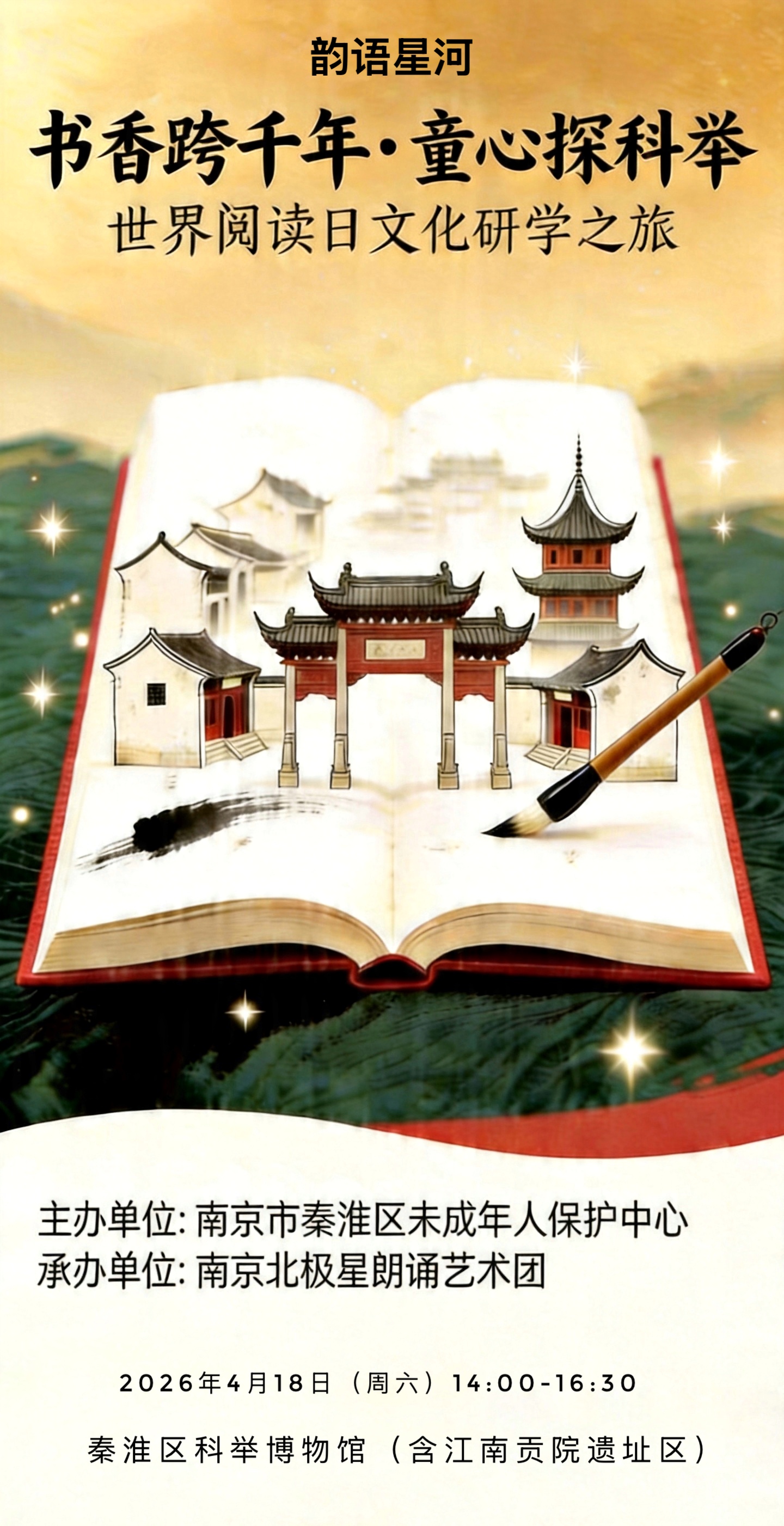 书香跨千年·童心探科举 ——世界阅读日文化研学之旅圆满举办 秦淮区未成年人保护中心联合南京北极星朗诵艺术团举办“书香跨千年·童心探科举”文化研学活动,带领困境儿童探访科举博物馆,通过手作、亲子共读与沉浸式朗诵体验,激发文化认同,筑牢文化自信,促进社会融入。 城市资讯 2026年04月20日