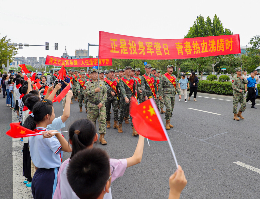 一人当兵,全家光荣。游行中,新兵家属们一路跟随,眼神中既有牵挂与不舍,更有自豪与骄傲。“当兵是孩子从小到大的梦想,我们都很支持他。”新兵家长张梦雅特地包了一盘水饺送给儿子,“在我们淮安老家,水饺也叫‘弯弯顺’,希望儿子在部队一切顺利,早传捷报。”