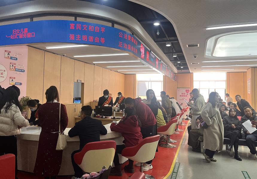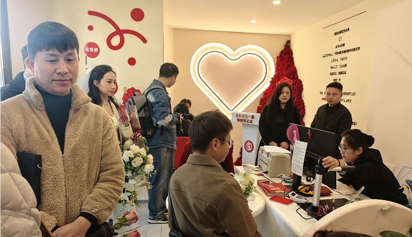 2月14日,新春将至、喜事盈门,云南省昆明市五华区民政局婚姻登记处处处洋溢着温馨喜庆的氛围。当天婚姻登记迎来新春前后小高峰,全区共办理结婚登记140对,其中五一路婚姻登记点办理70对。