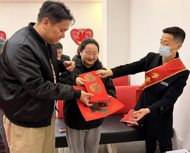 为让新人领证更有仪式感、幸福感与安全感,五华区委组织部、区民政局、区政务服务管理局、大观街道三合营社区联动发力,推出免费纪念照、新春送春联、义务婚前辅导、爱心赠玫瑰系列暖心服务,用温情与诚意见证幸福时刻。