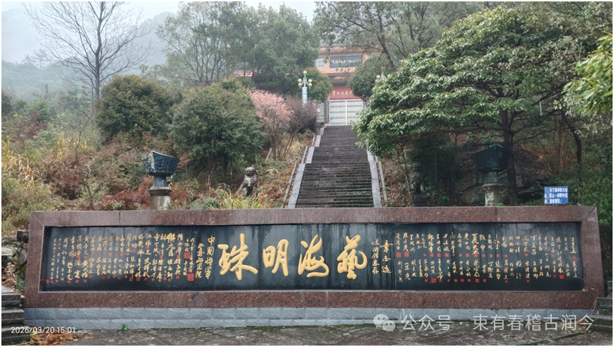 我们一行撑着雨伞拾级而上,当登上台阶的半腰处,在一个坡台台面上,“艺海明珠”四个遒劲的金色大字镶嵌在一堵书法艺术墙上。我们驻足观赏,也可趁机小憩一下。