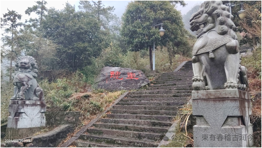 只见台阶道路的入口处,有两座石狮分列两侧。石狮神态憨厚,笑容可掬,像一对忠诚的哨兵,永远不知疲倦地迎接人们的到来。