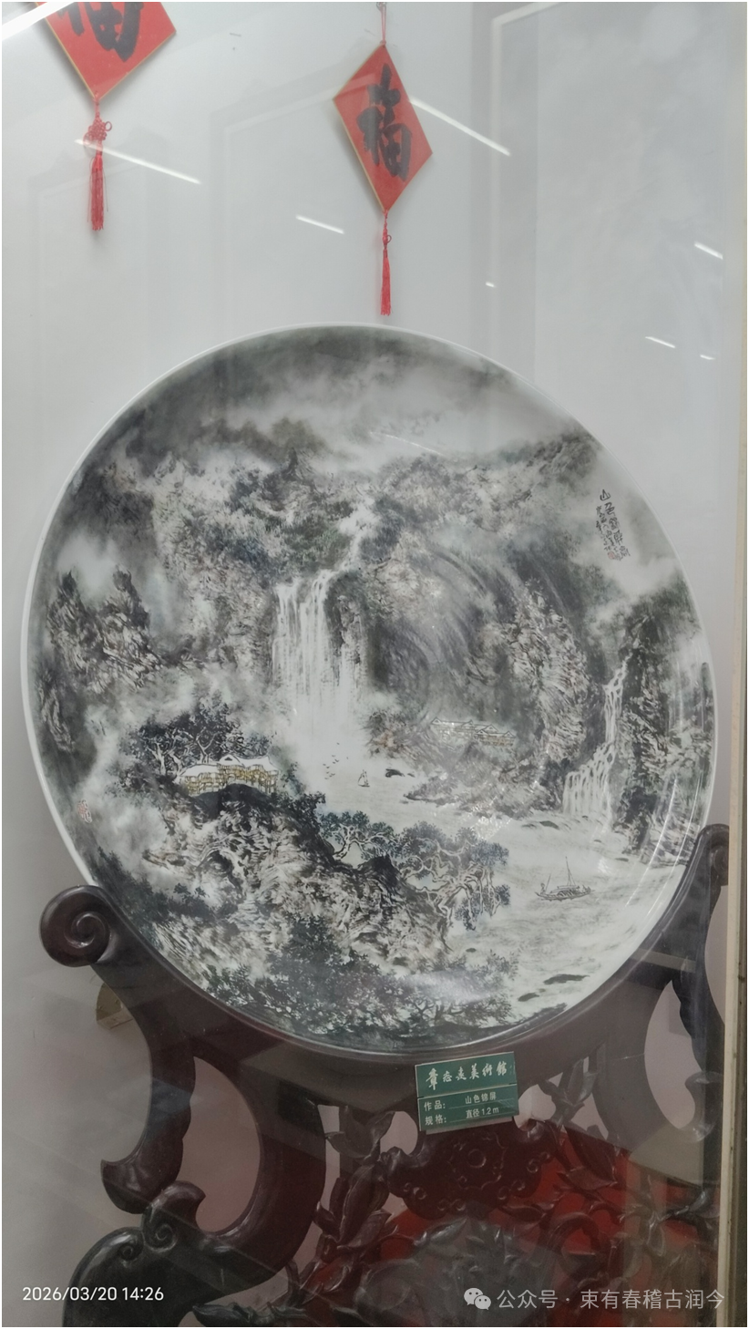 馆内目前陈列着的是根据章志远大师绘画作品烧制而成的200多块瓷版画和青花瓷瓶画。原来,自2004年开放后,十多年下来,因庐山地区气候湿润、雨水天气多,潮湿的天气对纸质画卷造成损坏现象日益严重。后来,不得不采取将纸质画作移植到瓷器上来进行烧制保存的方法,既将原件得到了很好保存,又让绘画艺术与景德镇陶瓷艺术交融生辉,催生了“瓷画”艺术新辉煌的呈现。由于瓷画烧制艺术的精致,乍一看,还根本分辨不出眼前的一幅幅山水画作佳品是纸质的还是瓷质的。可以说,这座美术馆,又可称为“章志远瓷画艺术馆”。