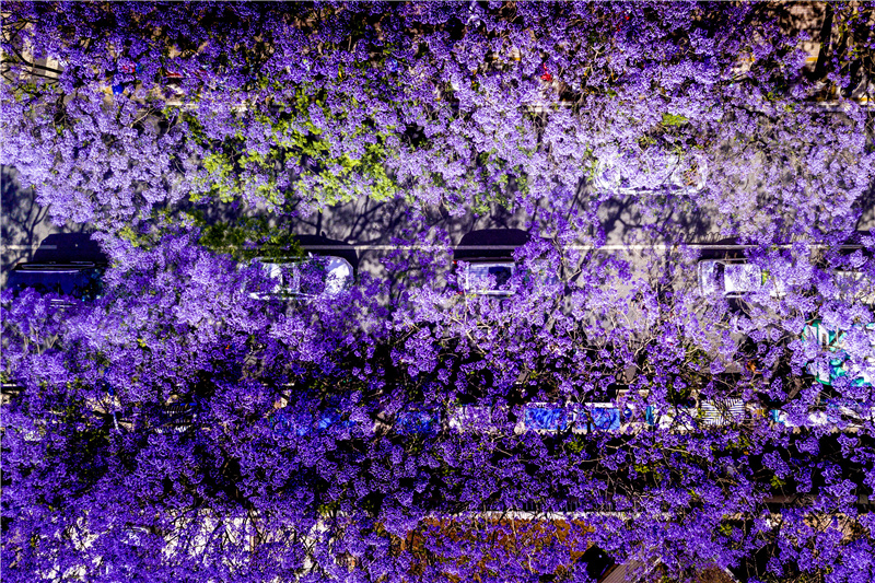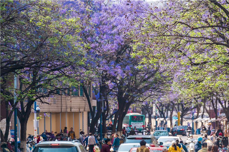 4月中旬至5月中旬,昆明蓝花楹如期盛放,教场中路等街区被紫色花海裹挟,化作浪漫十足的紫色花境,为期30天的限定花期,为“五一”假期注入了独有的滇式浪漫。五华区第八届蓝花楹艺术节于4月10日至5月10日温情启幕,其间推出文创集市、主题音乐节等丰富活动,更联动西山区同步开启“八万春”蓝花楹城市艺术季——前卫西路3.6公里蓝花楹长廊繁花满径,花香与咖啡香、艺术气息交融,打造出一步一景的春日画卷。
