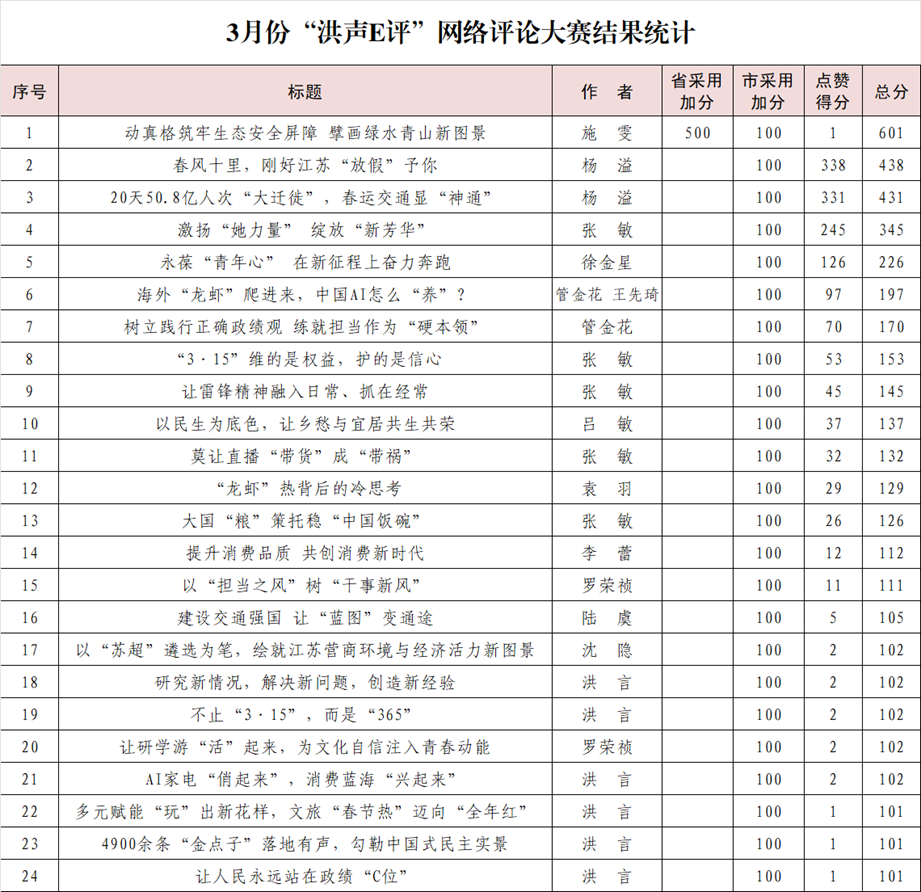 根据评分规则,3月份“洪声E评”网络评论大赛一等奖、二等奖、三等奖名单如下:
