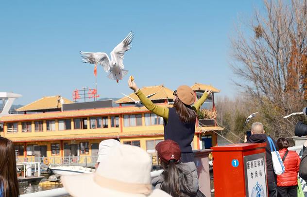 游客在滇池畔与红嘴鸥互动。陈思蒙 摄