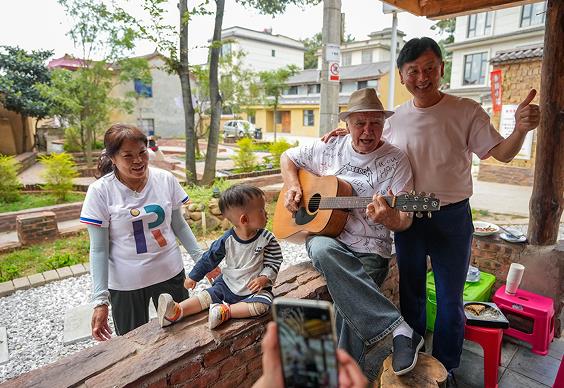 在土瓜冲村,来自加拿大的旅居客科特(右二)在聚会上边弹吉他边唱歌。新华社记者 陈欣波 摄