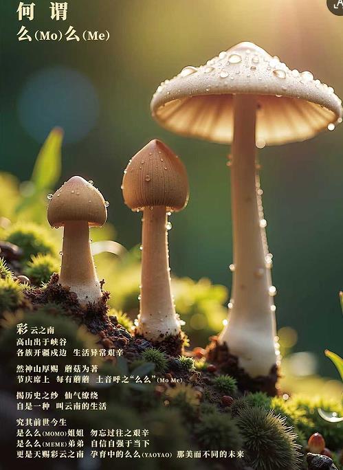 “彩云之南,高山出于峡谷,各族开疆戍边,生活异常艰辛。然,神山厚赐,蘑菇为著;凡节庆席,每有蘑蘑,土音呼之‘么么’(Mo Me)。究其前世今生,是么么(Mo Mo)姐姐,勿忘过往之艰辛;还是么么(Me Me)弟弟,自信自强于当下;更是天赐彩云之南,孕育中的么么(Yao Yao)那美而不同的未来!”