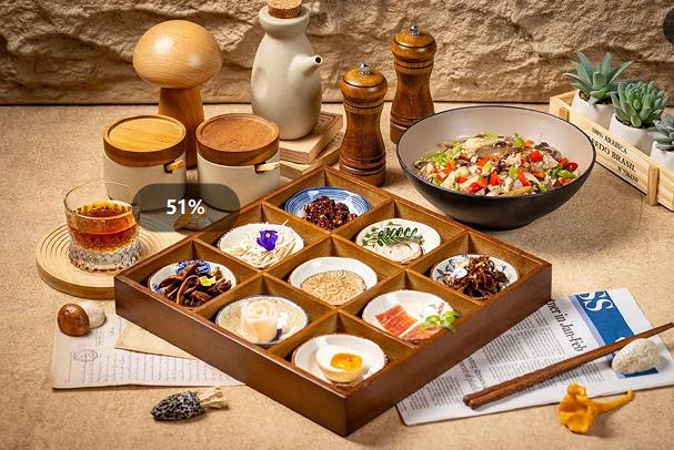这里还有特色的“九宫格搭配”:鸡枞渍温泉蛋、鸡枞菌油辣椒、鸡枞菌干、油炸冬瓜猪肉、鸡枞菌素鸡、时令菌(松茸、松露)、菌香肠、鲜鸡枞丝和油鸡枞。