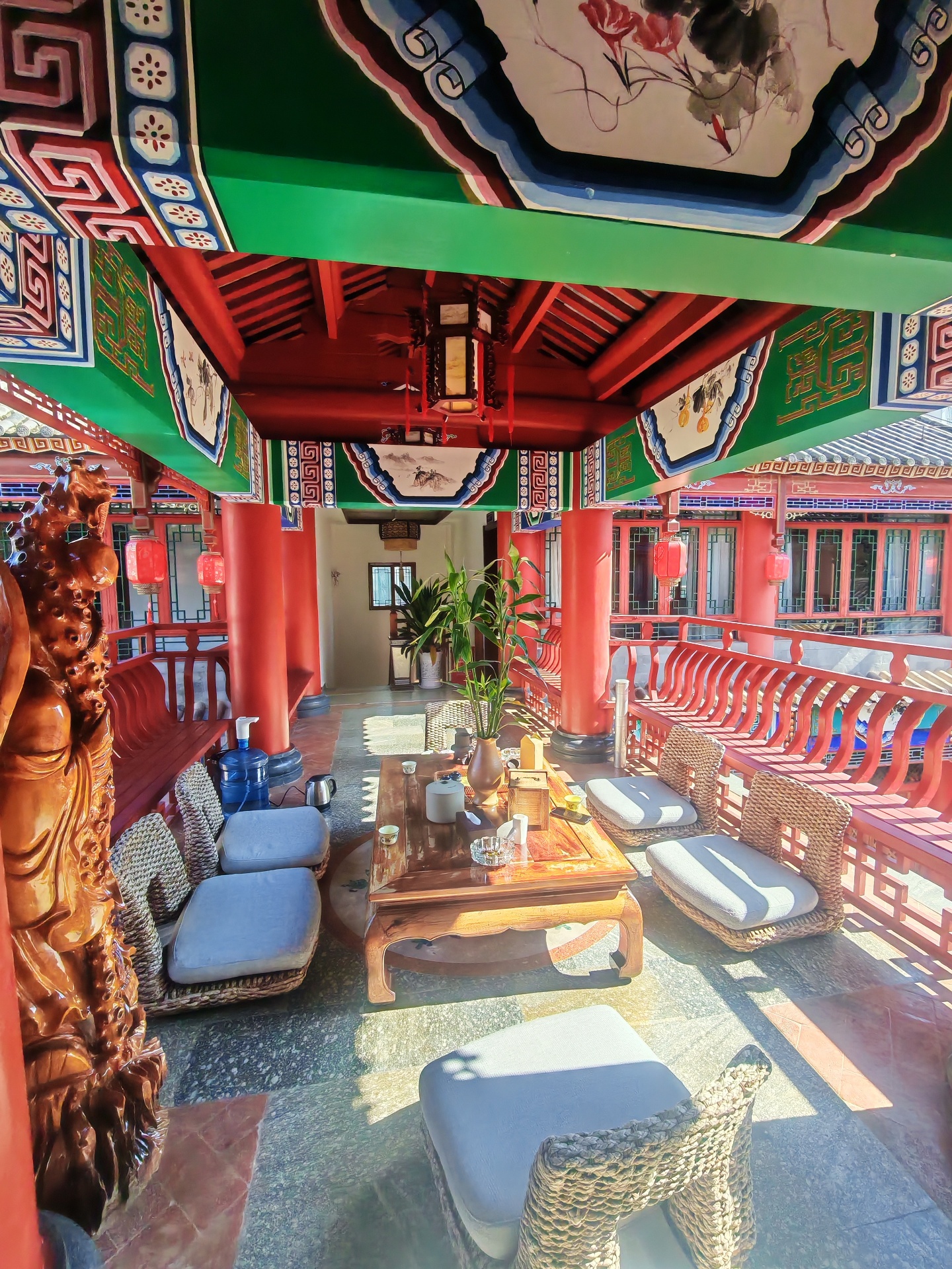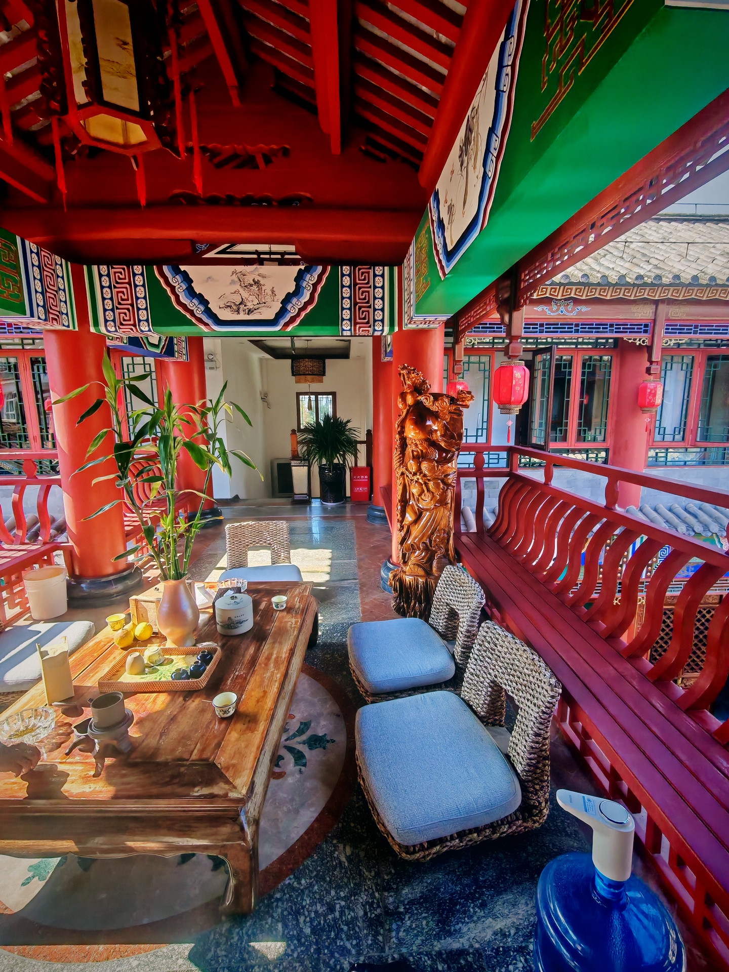 这家酒店就坐落在巍山古城旁,一脚踏进院门,就被传统的四合院落格局惊艳到。青瓦白墙搭配朱红廊柱,院里的绿植错落有致,红灯笼点缀其间,把大理南诏文化和老北京四合院的韵味揉在了一起,随手一拍都是古风大片。就像朋友打卡说的:“巍山楠诏四合院酒店,把南诏古韵和四合雅趣揉进了旅途里,古城边的惬意时光,太治愈啦~”
