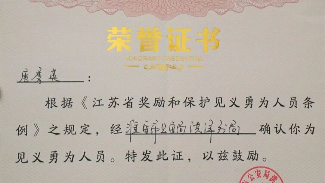 表彰她勇救落水邻居的善举