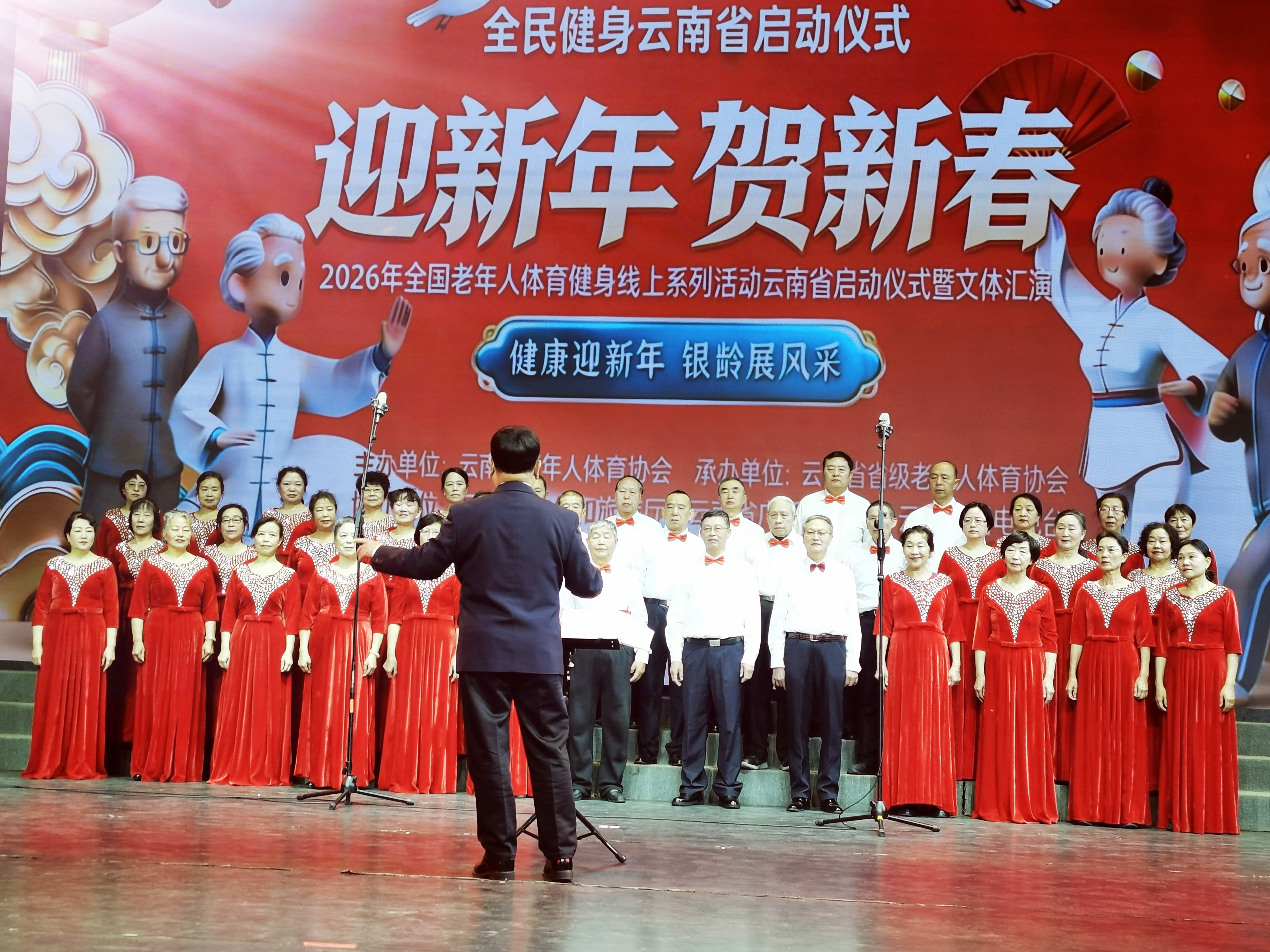 活动在全体合唱《没有共产党就没有新中国》的激昂歌声中拉开序幕。全场齐声高唱,气势恢宏,瞬间点燃了现场的热情。云南省省级老体协会长张佩英在致辞中向广大老年朋友致以新春祝福,高度赞扬他们为云南发展作出的重要贡献。她表示,此次活动既是一次老年文体成果的集中展示,也是一个促进交流、共享快乐的平台。