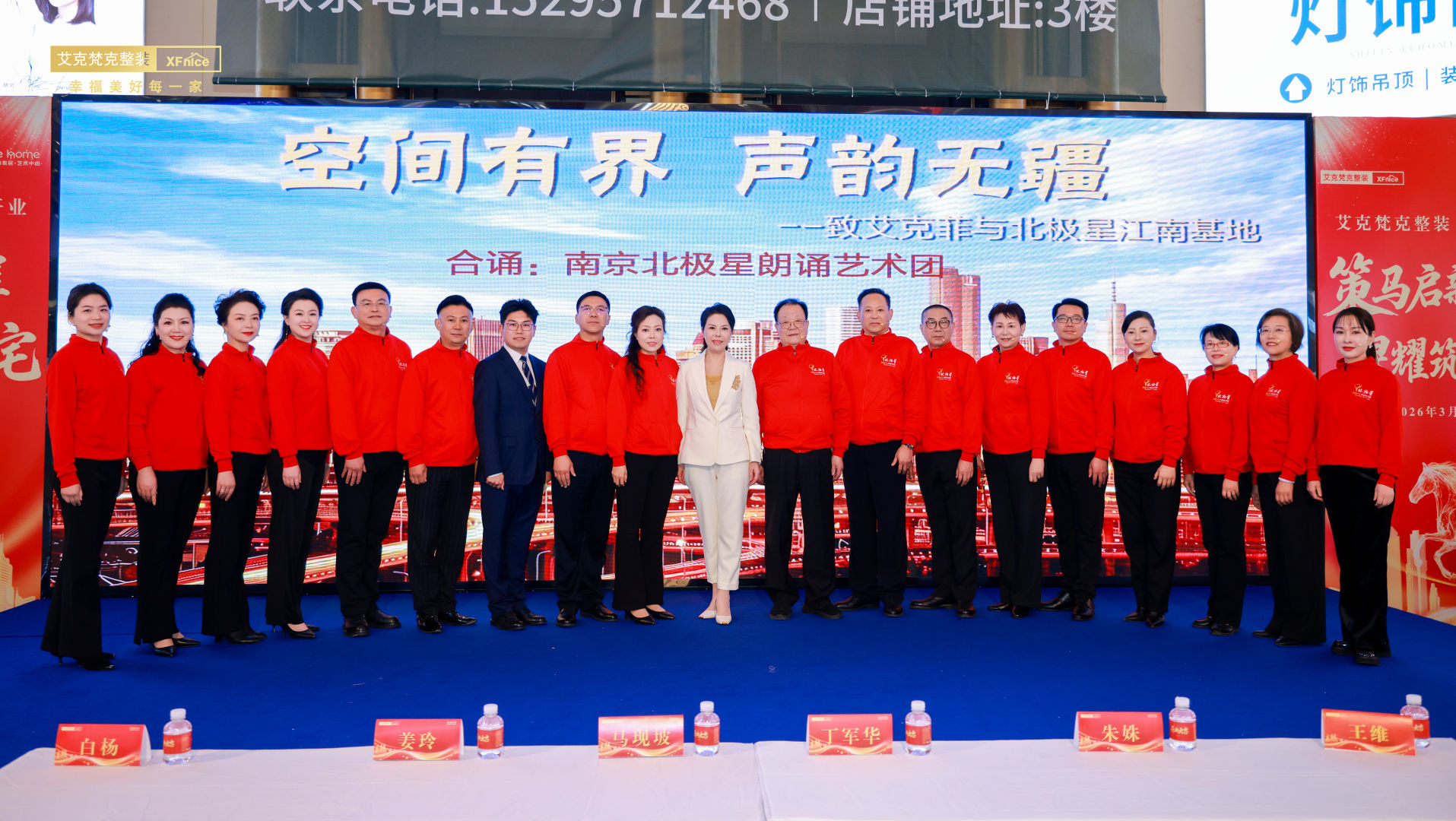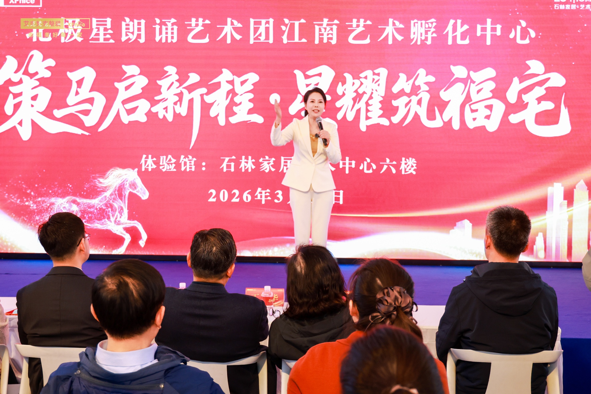 烟花三月,春意盎然。2026年3月22日,在石林家居艺术中心艾克梵克整装新展厅,北极星朗诵艺术团江南艺术孵化基地揭牌仪式隆重举行。这是继1月28日江北实训基地落成后,北极星“一江两岸、双核驱动”战略构想的完美闭环,标志着韵语星河·北极星朗诵艺术团正式进入双星闪耀的新征程。