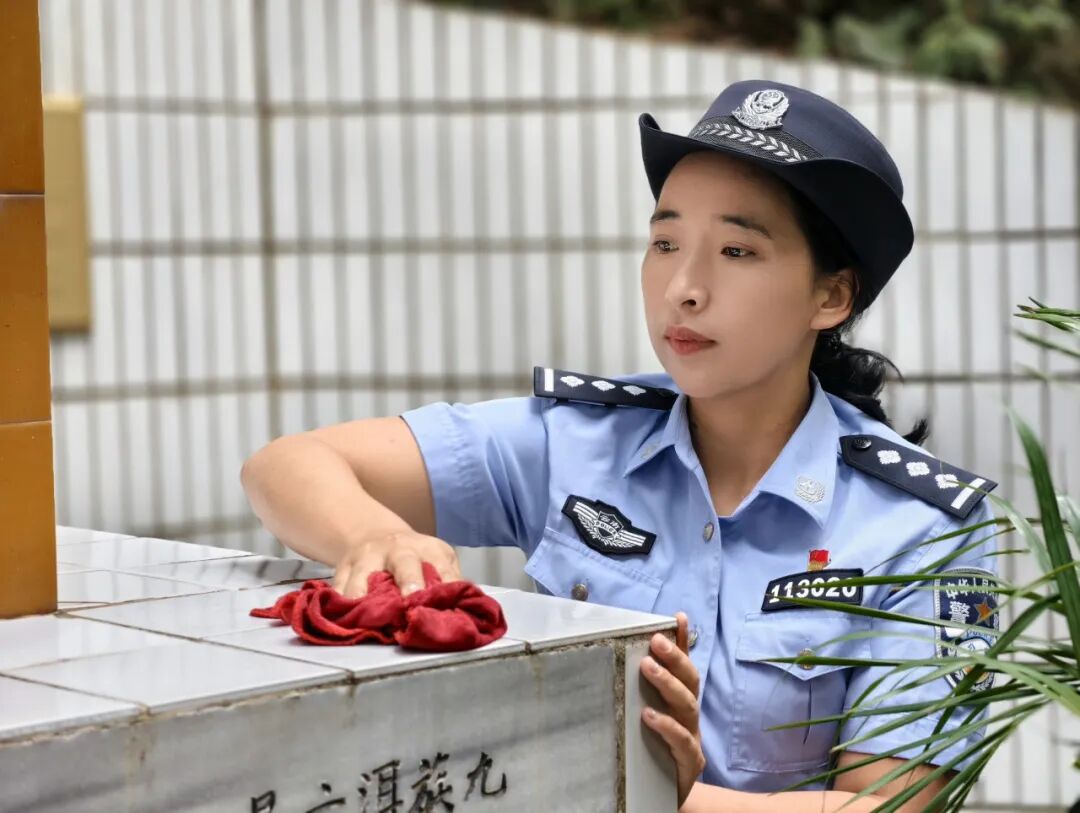在施翔宁烈士的纪念碑前,青年民警饱含深情轻轻擦去纪念碑上的尘土、扫除台阶上堆积的枯草,除去两旁的杂草,认真清理纪念碑旁的每个角落。